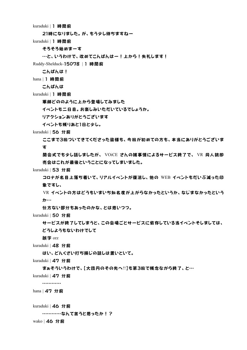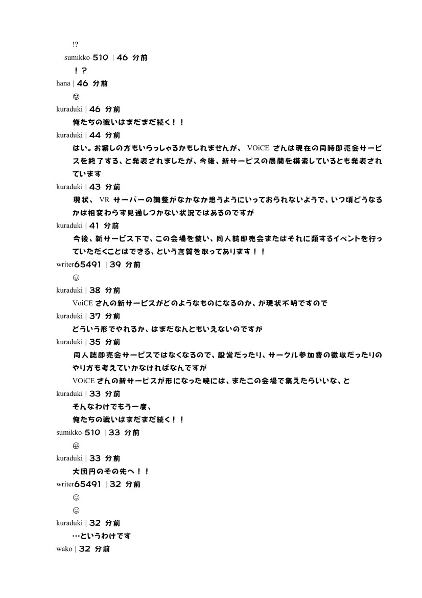 場を提供していただいていたVOiCEさんのサービス終了に伴い、イベントはいったん終了となりますが、VOiCEさんが新しいサービスを始められた暁には、なんらかの形でまたやれたらな、と思っております。
