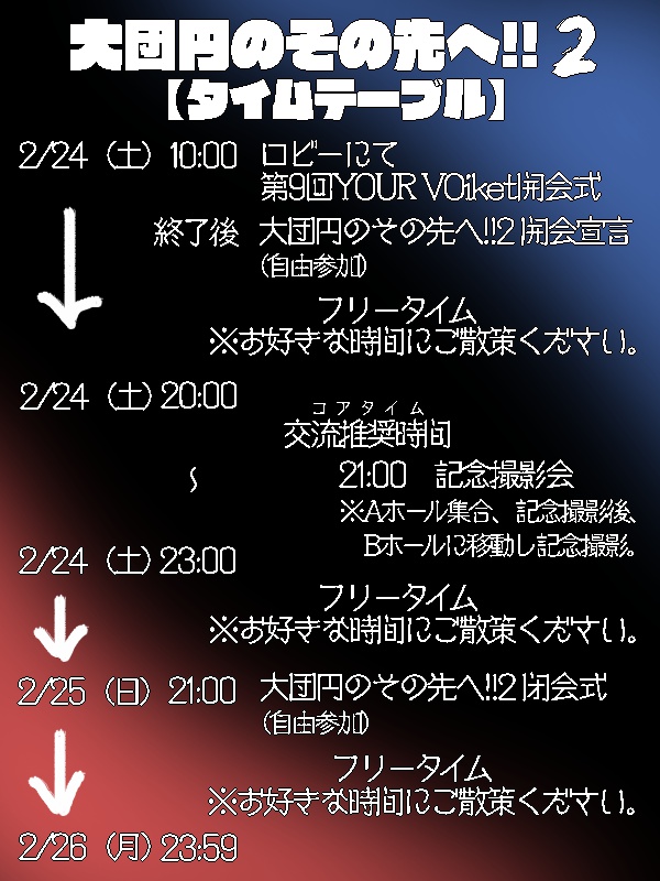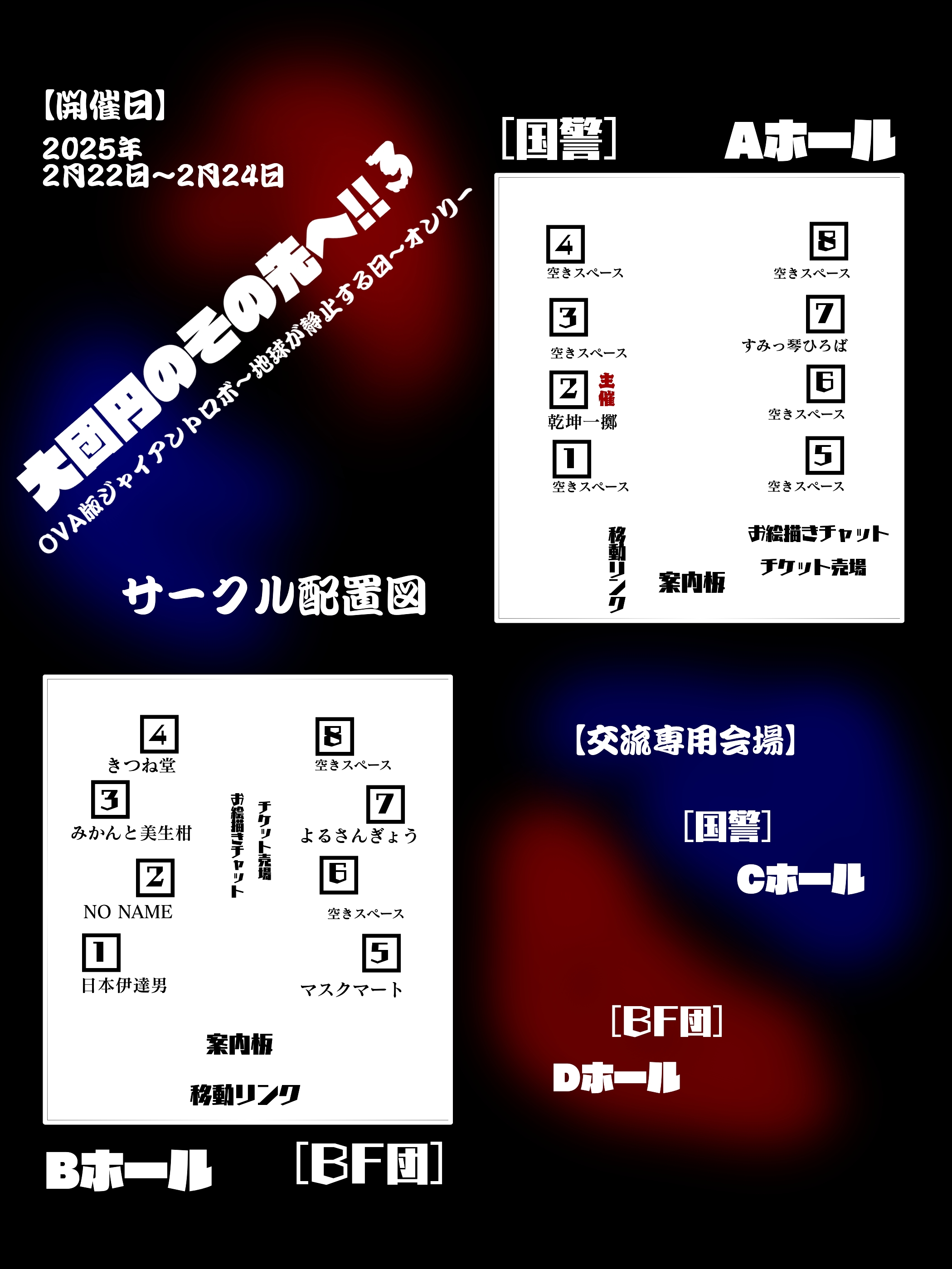 "案内"カテゴリーの記事一覧 [PR] ×[PR]上記の広告は3ヶ月以上新規記事投稿のないブログに表示されています。新しい記事を書く事で広告が消えます。 始まりました! 【大団円のその先へ!!3】 無事イベント始まりました! 会期はたっぷりありますので、お時間のある時にごゆっくりお楽しみください。 こちら、各会場個別の入場用アドレスとなります。 ご活用ください。 ▶エントランスルーム: https://hubs.voice-doujin.space/donD4Ui/entranceroom-daidanen3 ▶Aホール【即売会・国警】: https://hubs.voice-doujin.space/BRXjhFQ/daidanen3-a ▶Bホール【即売会・BF団】: https://hubs.voice-doujin.space/YT8xpdW/daidanen3-b ▶Cホール【交流用・国警】: https://hubs.voice-doujin.space/izVtzKN/daidanen3-c ▶Dホール【交流用・BF団】: https://hubs.voice-doujin.space/5JXxNtK/daidanen3-d [1回]PR サークル配置&参加サークル サークル配置図と参加サークル様はこちら。 ※交流専用ホール(C・D)もあります。 [国警]Aホール A-1 A-2 乾坤一擲(主催) A-3 A-4 A-5 A-6 A-7 すみっ琴ひろば(中呉イラスト) A-8 [BF団]Bホール B-1 日本伊達男(オールキャラ漫画イラスト) B-2 NO NAME(セルアル小説) B-3 みかんと美生柑(セルアル小説R18) B-4 きつね堂(セルアル小説R18) B-5 マスクマート(残月イラスト) B-6 B-7 よるさんぎょう(セル草漫画R18) B-8 [0回] 大団円のその先へ!!3 2025年2月22日(土)〜2月23日(日) いよいよ開催です! こちらVOiCEさんのVR同人誌即売会サービス最後のイベントとなります。 予定タイムテーブルはこちら。 [0回] 【大団円のその先へ!! 2】タイムテーブル [1回] 【フライヤー配布情報】 下記店舗にて、フライヤーを委託配布していただいております(五十音順) 委託先はぼちぼち増やしていく予定です アニメイト天王寺店 メロンブックス大阪日本橋店 らしんばん大阪日本橋店本館 [追加] メロンブックス蒲田店 らしんばん横浜店 [イベント配布] 12/30(土)冬コミ1日目 東1ホールF60b[日本伊達男]様 [0回]